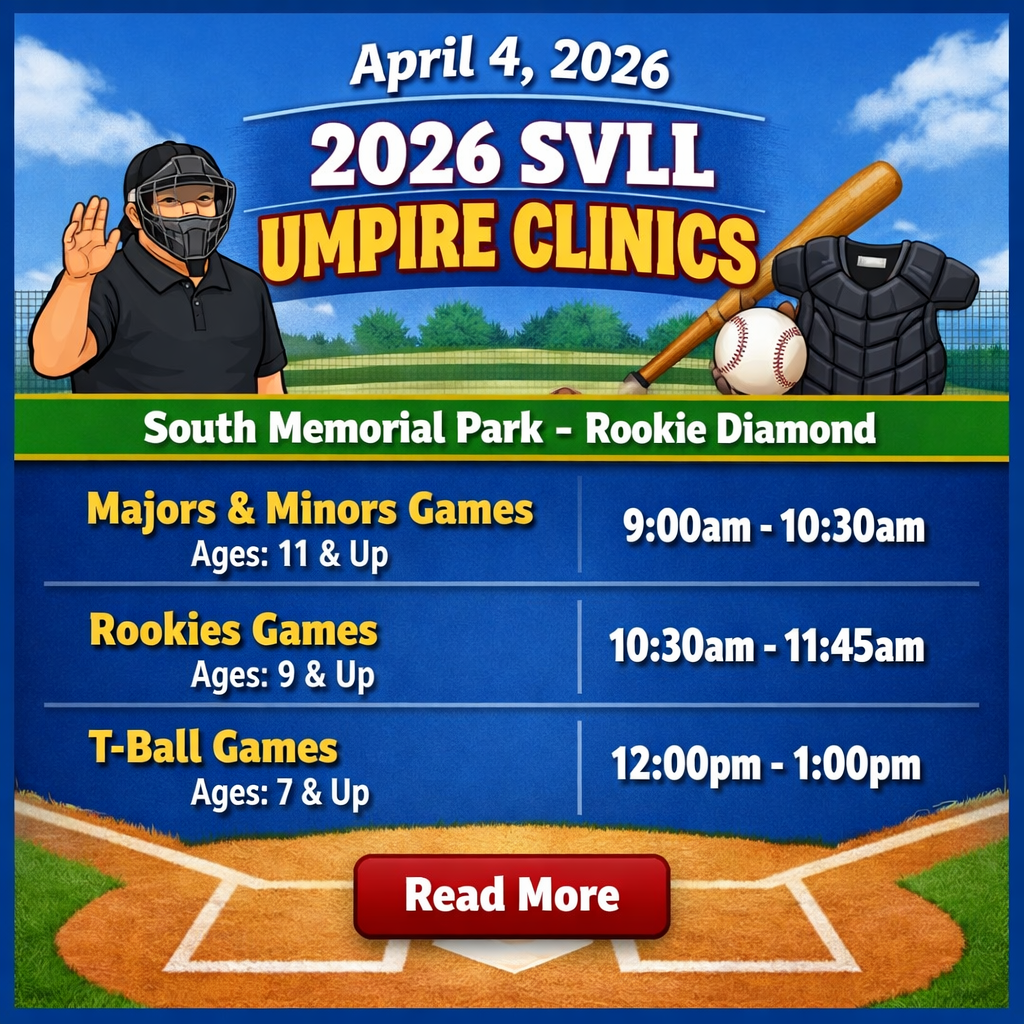 April 4, 2026 2026 SVLL Umpire Clinics Read More All interested players are invited to the 2026 South Van Little League Umpire Clinics on Saturday April 4th. Umpiring is a great way for your child to learn more about the game of baseball and develop important life skills such as leadership, responsibility, and teamwork. Anyone who wishes to umpire this season…
